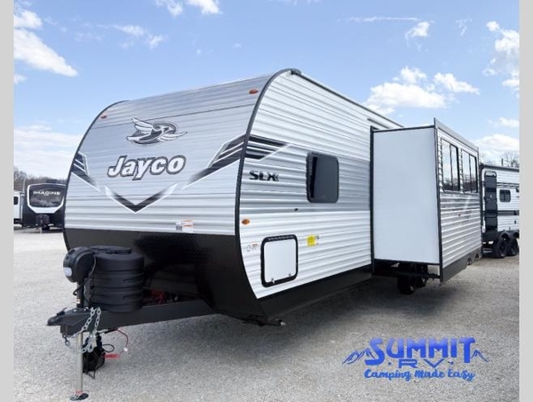 The Jayco Jay Flight SLX travel trailer is quite easy to own because it is lightweight for an easier towing experience. Built on a fully integrated A-frame with galvanized-steel, impact-resistant wheel wells, the Jay Flight SLX has quality at its very foundation. That quality continues on to the electric self-adjusting brakes, easy-lube hubs, Magnum Truss roof system, and LP quick connect. Some of what the mandatory Customer Value Package includes is backup camera prep, Keyed-Alike entry and baggage doors, and an on-demand tankless water heater.