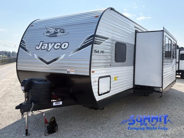 The Jayco Jay Flight SLX travel trailer is quite easy to own because it is lightweight for an easier towing experience. Built on a fully integrated A-frame with galvanized-steel, impact-resistant wheel wells, the Jay Flight SLX has quality at its very foundation. That quality continues on to the electric self-adjusting brakes, easy-lube hubs, Magnum Truss roof system, and LP quick connect. Some of what the mandatory Customer Value Package includes is backup camera prep, Keyed-Alike entry and baggage doors, and an on-demand tankless water heater.