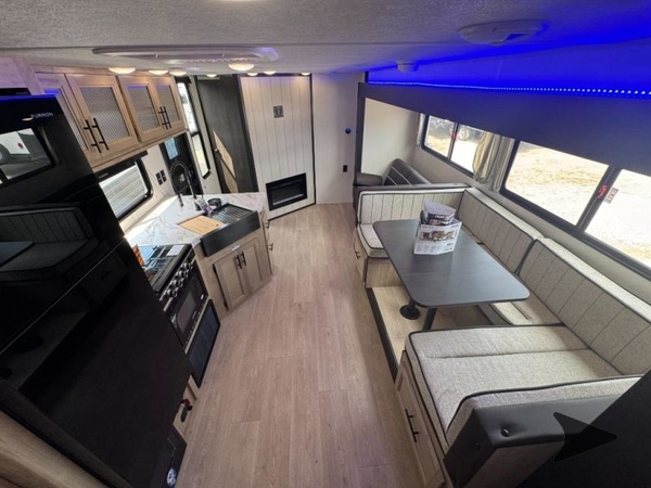 You will love how easy it is to enter/exit this travel trailer with dual entry doors! The rear door leads into the living/kitchen area where you will notice the large U-shaped dinette and the sofa which sit on the slide and create a spacious footprint for moving about, as well as great places to play games and socialize with your friends and family. Plus, there is an entertainment center with a fireplace and a fully equipped kitchen to keep everyone's bellies filled with delicious home cooked meals. At night, there is sleeping space for everyone between the bunks above the sofas with a table in the rear private bunkhouse and the RV king bed in the front private bedroom, plus the furniture can convert into sleeping spaces. The walk-through bathroom leads directly into the bedroom too!
