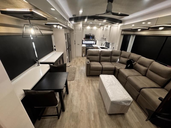 Each Pinnacle fifth wheel features Stronghold VBL lamination for the lightest, yet strongest construction in the RV industry. Add that to the Magnum Truss XL6 roof system and Climate Shield zero-degree tested weather protection and you'll be enjoying your fifth wheel even in harsh weather. Some of the exterior conveniences you will appreciate are the Keyed-Alike lock system, the fully enclosed, universal docking center, and the 6-point hydraulic auto-leveling system for quick and easy set up. The 5 Star Handling Package will make towing a fifth wheel a walk in the park, and the two Whisper Quiet A/C units will keep you comfortable during the hot summer months. Inside, you'll enjoy the residential "Do it all" sink, the solid hardwood cabinet doors, stiles, and fascia, the vinyl flooring throughout, plus many more comforts. There is even a central vacuum system, a wireless remote-control system, 12V charging station, plus many more conveniences to make each trip enjoyable.