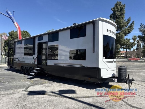 With any Foundation destination trailer by Grand Design, you can choose to stay longer surrounded by residential inspired features! The durable construction includes aluminum framing with a temperature-controlled fiberglass laminated wall, composite exterior decking with waterproof woven vinyl flooring, quad seal protection, and an industry-leading maintenance-less one-piece roof with composite roof decking panels. There is also an exterior convenience center, brass plumbing fittings, an 8' 5" wide body frame, and sleek bonded square glass windows. The interior is packed with residential features, including GE appliances, motorized shades in the living room and kitchen, solid surface countertops in the kitchen and bath, and the list goes on!