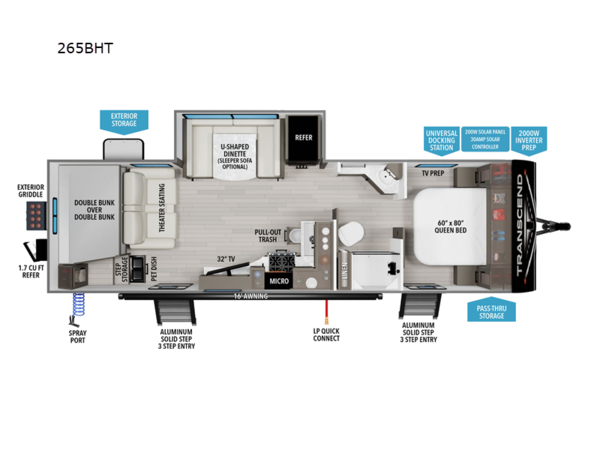 The 2025 Grand Design Transcend 265BHT delivers the perfect blend of family functionality, off-grid capability, and all-season comfort. With double bunks, theater seating, dual entry doors, and two powerful A/C units, this travel trailer is ready for your next adventure.
