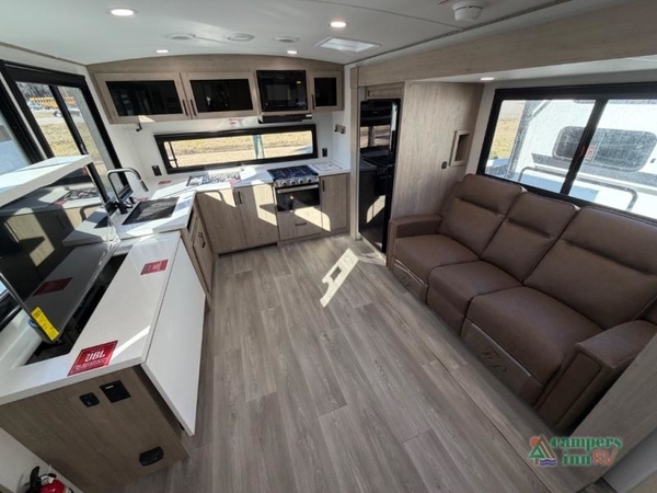 At the front of the 2700BS trailer, youll find a spacious full bedroom featuring a 70" x 80" king bed housed in one of two slide outs, offering both generous space and a comfortable nights rest. The room also includes a wardrobe and dresser, providing ample storage for clothing and essentials. Moving toward the center, the walk-through bathroom boasts a 30" x 36" residential walk-in shower with a skylight, a toilet, and a sink opposite a mirrored medicine cabinet for added convenience and storage. At the rear, the open-concept kitchen and living area make excellent use of the second slide out, which includes cozy theater seating, perfect for dining or relaxing while watching TV. Next to it sits a 10-cu. ft. refrigerator, offering plenty of room for groceries and refreshments. Across the space, the L-shaped kitchen spans the entire rear wall, giving you extensive countertop room for meal prep. Equipped with a three-burner range, oven, microwave, and stainless steel sink, this kitchen allows you to cook in comfort and style without relying on campsite facilities.