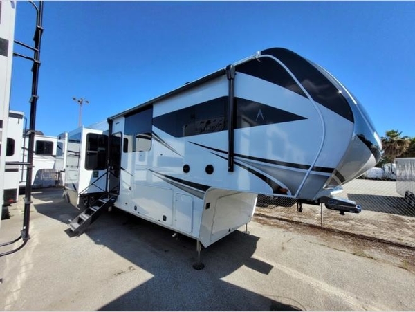 Designed for comfort on every journey, this spacious fifth wheel is ready for wherever the road takes you. The raised rear kitchen gives the cook plenty of room to whip up any type of meal using the stainless steel appliances including a built-in oven, an oversized pantry, and the raised bar top will provide you even more counter space on top of dining with two chairs that overlook the middle living area. Relaxing is made easy thanks to two tri-fold sofas and theatre seating while watching the big game on the LED Smart TV and enjoying the fireplace below. At night, retire to your own queen bed which slides out to provide more floor space, and you can store your clothes in the slide top dresser and front closet with washer and dryer prep.