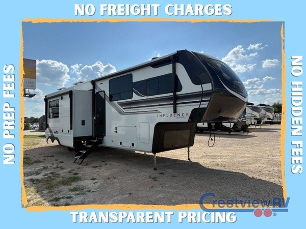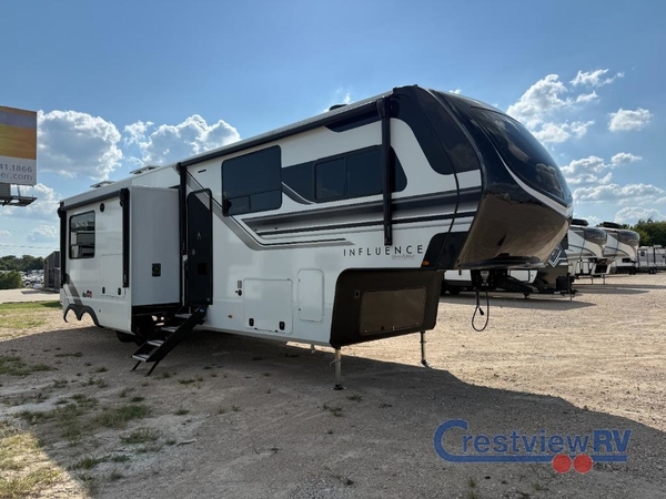 Any Grand Design Influence fifth wheel features five-sided aluminum cage construction with a walk-on roof and a fully enclosed underbelly with heated tanks and storage for all weather camping. For peace of mind, the MORryde CRE3000 Suspension system will provide safe and smooth towing, and the 101" widebody construction offers all the room you need and that is before multiple slides are fully engaged. You will appreciate the Keyed-Alike locks, slam-latch baggage doors with magnetic door catches, exterior security light, and SolidStep entry steps. On the inside, Congoleum flooring, premium roller shades for privacy, a hallway handrail for safety, and nightstands with USB ports to keep all of your electronics fully charged. You will also love the On Demand tankless water heater when showering, plus the added heat and ambiance from an electric fireplace, and so much more!