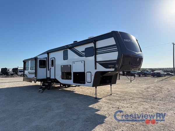 With any Reflection fifth wheel by Grand Design, you will have a solar panel for off-grid camping and a 60 amp charge controller and inverter prep, a Universal All-In-One docking station, unobstructed pass-through storage, and Goodyear Endurance tires. Each is constructed of gel coat exterior sidewalls, residential 5" truss rafters, walk-on roof decking, a fiberglass and radiant foil roof and front cap insulation plus laminated aluminum framed side walls, roof and end walls in slide rooms. Head inside to enjoy residential hardwood cabinet doors, premium Congoleum flooring, a spacious shower with a glass door, and many more comforts!
