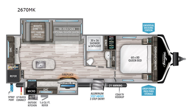 With any Imagine by Grand Design the construction includes a laminated aluminum framed main floor, rear wall, side walls, roof and end walls in the slide rooms and floors, plus a one-piece roof membrane giving you years of lightweight towing to your favorite destinations. Best in class storage is found in the exclusive drop frame unobstructed pass through storage, and the Universal Docking station offers an all-in-one location for utilities and hookups, plus you will find industry leading tank capacities and extended season camping with the mandatory four-season protection package. Inside you will experience residential cabinetry and a pull-down sprayer kitchen faucet, upgraded residential furniture and countertops, plus much more with an 81" radius ceiling for a spacious interior. Choose your favorite Imagine today, and start adventuring in a lightweight and comfortable trailer!