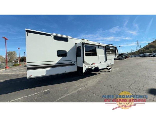 Grab the whole gang and head out in this fifth wheel featuring two private bedrooms, two full baths, and quad slides for even more space in this widebody layout. The living area featuring dual opposing slides offers space to dine and relax including an L-shaped sofa with recliners opposite the entertainment center and fireplace. You'll also love the full kitchen with ample counter space, a spice rack above the microwave, a pull-out pet dish, and more convenient features. The front master bedroom includes a queen bed with an optional king bed, a private entrance into the dual entry bath, plus a slide out with the wardrobe and bath sink. And your guests can take the second master bedroom with a folding queen bed slide, washer and dryer prep, a full rear bath, and even a loft above for more sleeping space!