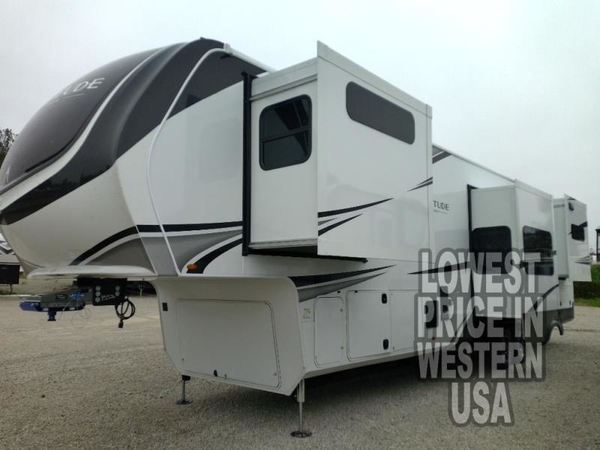 Each Solitude fifth wheel by Grand Design features a 101" wide-body construction, heavy duty 8,000 lb. axles, frameless tinted windows, and high-gloss gel coat sidewalls. You can camp during harsh weather thanks to the Weather-Tek Package that includes a 35K BTU high-capacity furnace, an all-in-one enclosed and heated utility center, and a fully enclosed underbelly with heated tanks and storage. Inside, you'll love the premium roller shades, hardwood cabinet doors, solid surface countertops, plus residential finishes throughout to make you truly feel at home. Each model also includes a MORryde CRE3000 suspension system, and a MORryde pin box that will provide smooth towing from home to campground. Affordable luxury is possible with the Solitude fifth wheels; choose yours today!