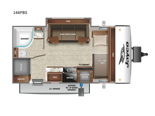 Weekends at the lake are made comfortable in this single slide out travel trailer. You will enjoy your own 54" x 80" front bed so you don't have to sleep on the floor, plus there is a jack-knife sofa if you have an overnight guest. The full bath features a radius shower with a skylight, plus plenty of storage space for your medicines and toiletries. This model includes a microwave oven and a three burner cooktop to prepare meals each day, and a 6 cu. ft. gas/electric refrigerator for perishables. You will also find an exterior refrigerator for cold drinks, plus a Jayport system with an LP quick connect.