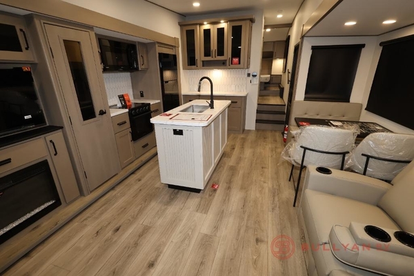 Get ready to enjoy everything the campgrounds and surrounding area has to offer when you are setup to camp in this fifth wheel! The two electric awnings offer protected areas creating outdoor living spaces; just grab your camping chairs from the unobstructed pass-through storage. And the interior offers a spacious living area and kitchen combination with dual opposing slides for maximum space. You can sit on the tri-fold sofa or the dinette to lounge back and rest after a day of adventure. The hutch and kitchen island offer counter space to prepare and serve meals, and there is a large pantry for goodies. The 40" LED HDTV with a fireplace below provides entertainment before bedtime or on a rainy day. And the front bedroom offers privacy, a walk-around queen bed, and plenty of storage!