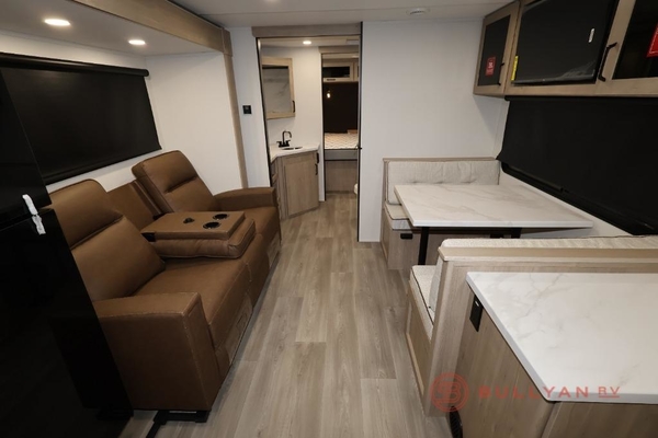 Treat yourself to a weekend of fun in this Imagine XLS travel trailer! Whether it's just you and your spouse, or you've chosen to bring along a group of friends, this trailer will meet your needs. The front bedroom can sleep two people on the walk-around queen-size bed. The bedroom is quite functional because it not only contains the second exterior entry door, but it also has a private entrance into the walk-through bathroom since it is located on the other side of the bathroom. The booth dinette is functional too because it can transform from a dining location into a sleeping location, and the theater seating is directly across from the LED TV for easy viewing. The rear kitchen is fit for the chef on the trip, it features residential countertops, a stainless-steel sink and a 3-burner range with oven for you to cook your meals in comfort.