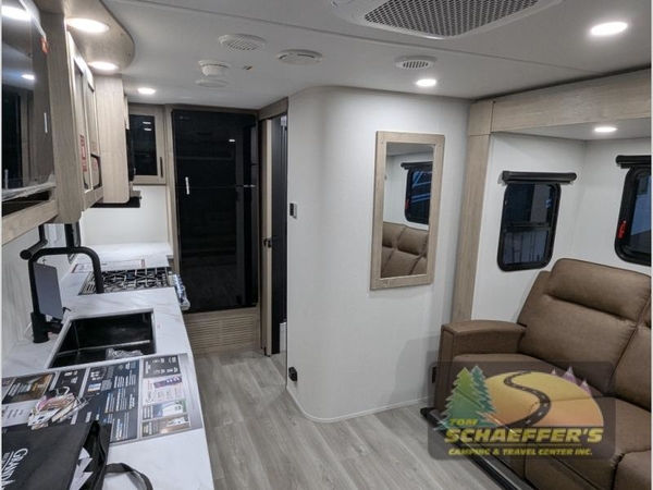 The Murphy bed is the eye-catching feature on this Imagine XLS travel trailer! Not only can it fold away in the morning to reveal a sofa for lounging, but it will also provide you with drawer storage under the sofa. Another functional feature is the theater dinette with a removable table in front, or you can choose the optional U-shaped dinette if you like to gather around for game night. It rests on the single slide so that there is more floor space, and it offers you great comfort while you dine across from the LED HDTV. A full bathroom will keep you clean and fresh with its residential walk-in shower, skylight, linen closet, vanity, toilet, and power vent fan.