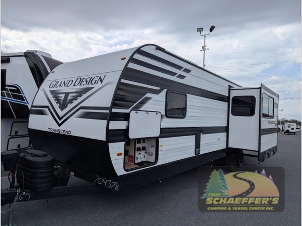 With any Transcend travel trailer by Grand Design, you will enjoy upscale appointments and convenient amenities to make each camping experience one to remember! The Quad Seal technology, residential insulated walls, plus heated and enclosed underbelly with suspended tanks make these units solid and durable. There is a black automotive glass door outside, along with a Safe-T-Rail assist on the main entry door, backup camera prep, and a universal docking station. JBL interior and exterior speakers plus a JBL head unit will let you listen to your favorite tunes as you visit under the power awning with LED strip lights. Inside, you'll enjoy multiple outlets to keep your gadgets charged, thermoformed and seamless countertops, and a 6' 6" interior height so you won't feel closed in. The Solar Prep Package will allow you to enjoy off-grid capabilities with a 200W solar panel, which is wired for up to 600W, a 30 AMP Bluetooth solar controller, a 2000W inverter prep, and more!