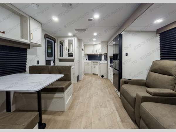It will be so easy to enjoy camping trips in this travel trailer for five to six! The main living area is made spacious by the large slide out, and here you'll find the 60" sleeper sofa and the kitchen appliances. A booth dinette across the room provides a place to dine and play board games, or you can head outdoors to sit under the 17' power awning with LED lights. The queen bed in the front private bedroom will have you feeling right at home, and the TV prep here gives you the option to watch movies in bed. This model also includes a rear corner kitchen with ample counter space and a large sink, and you'll find the full bath in the other rear corner!