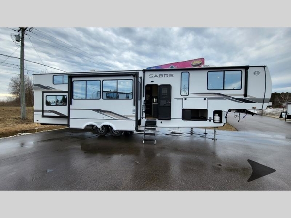 You will experience luxurious camping trips at an affordable price with any one of these Forest River Sabre fifth wheels! These models are durable and ready to travel anytime of the year thanks to features like the high-gloss gel-coat front cap with LED lighting, the PVC roof membrane, and the forced air underbelly with enclosed gate valves. The electric auto-leveling system makes setting up easy and safe, and the adjustable power awning with LED lighting will create an inviting outdoor living space. Each model includes a universal docking station which includes a black tank flush and an outside shower, and detachable and adjustable stable steps for you to enter and exit the unit safely. Inside, you will love the design of the ambient accent lighting in the living area, the real wood lumbercore cabinetry, and the linoleum flooring!