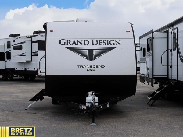 With any Transcend One travel trailer by Grand Design, you will enjoy lightweight towing thanks to their single-axle. There are many interior comforts to make camping easier than ever, such as recessed lighting, residential countertops, and a 6' 6" interior height. Each model is constructed with a heated and enclosed underbelly with suspended tanks, a moisture barrier floor enclosure, and Thermofoil over the roof and front cap for added protection. And a JBL sound system will let you listen to tunes as you visit under the power awning with a Fusion light!