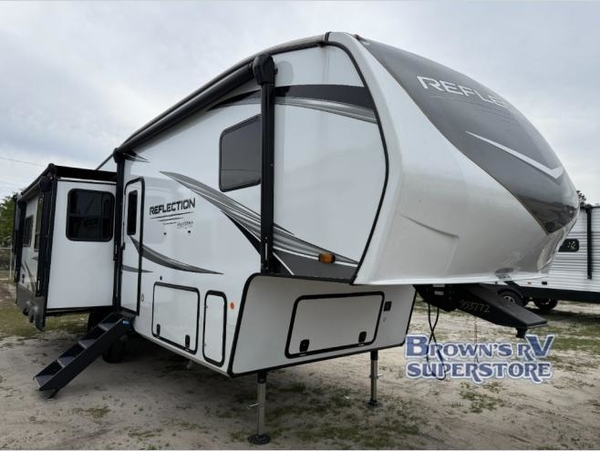 With any Reflection fifth wheel by Grand Design, you will have a solar panel for off-grid camping and a 60 amp charge controller and inverter prep, a Universal All-In-One docking station, unobstructed pass-through storage, and Goodyear Endurance tires. Each is constructed of gel coat exterior sidewalls, residential 5" truss rafters, walk-on roof decking, a fiberglass and radiant foil roof and front cap insulation plus laminated aluminum framed side walls, roof and end walls in slide rooms. Head inside to enjoy residential hardwood cabinet doors, premium Congoleum flooring, a spacious shower with a glass door, and many more comforts!
