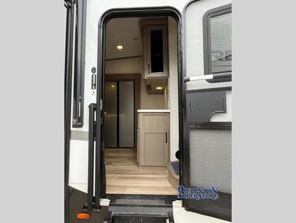 Whether you travel for pleasure or work, you will love the spacious main living and kitchen area with a rear tri-fold sofa that doubles as extra sleeping space, and the theater seating directly across from the entertainment center with a 40" LED HDTV and a fireplace below. The kitchen island will make meal prepping and drying the dishes easier and the hutch is the perfect place to place your picture frames, nice dishes, and extra cooking items. There is even a pantry that is big enough to store all of your favorite snacks, dry ingredients and such. Outside you can enjoy two electric awnings that provide protection from the elements as you relax and visit with other RVers, and your camping chairs can easily be stored in the pass-through compartment. The double entry bathroom is convenient especially at night when you can slide the door to enter from the front master bedroom. You will find plenty of storage for your clothing and gear, plus the bedroom slide out gives you drawers and linen storage that stretches into the full bathroom.