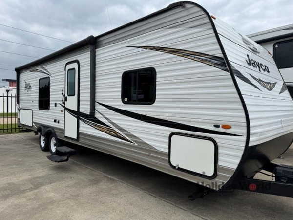 With any Jayco Jay Flight SLX 8 you will appreciate the 8-foot wide body, the reliability of the Goodyear tires made with galvanized steel and impact-resistant wheel wells, and the handy Keyed-Alike entrance, plus baggage doors for protection on the road. You will also appreciate the spacious exterior storage for you to easily access your camping gear. Inside you will find modern kitchen appliances including a three burner range with a 9,000 BTU Super Burner and piezo igniter, a Norcold refrigerator, and a microwave oven. In every model, there is a queen Simmons mattress to re-charge for your next adventurous day, and there is also a bathroom skylight to let in some natural lighting. Come see which model fits your lifestyle the best!