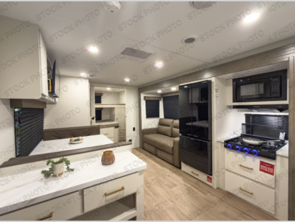 You're going to love every minute spent in this Transcend travel trailer! Your guests or the little ones will have the rear bunkhouse all to themselves that includes a residential full-size bed and two bunks, storage drawers, and TV prep if you want to add a television here. You'll enjoy your own space up front in the private bedroom with a queen bed, storage drawers, and TV prep here also. The combined kitchen and living area includes a sleeper sofa with an optional theater seating, a booth dinette where you can dine together, and a 32" TV for movie nights! The exterior is just as accommodating with its 20' awning, rear storage, plus exterior griddle and refrigerator!