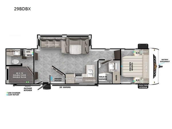 When you're ready to upgrade your RV to a unit with more sleeping space and comfort, choose this Wildwood travel trailer, and you'll never look back. After setting up camp, put out the large slide and prepare lunch indoors or outside at the outdoor kitchen, and the 20' power awning will shade you from the sun. The kids will find all their snacks in the hidden pantry behind the entertainment center, and their drinks in the oversized fridge. The U-shaped dinette is a part of the Versa Lounge, and it will provide comfortable seating space. This model features a rear private bunkhouse with a set of double bed bunks, a desk and a half bath. You will also love the front private bedroom that includes a custom king bed and dual bedside closets with nightstands below.