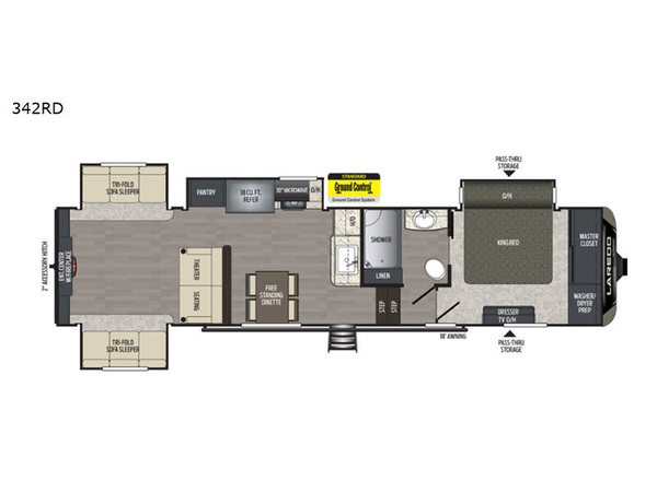 For the family who loves to entertain, this Laredo fifth wheel, with its large rear den, is perfect for gathering everyone together for a movie night. You will also find sleeping space on the dual tri-fold sofa sleepers. Just outside the living room is the kitchen where you can quickly grab a snack from the large pantry or 18 cubic foot refrigerator without missing a moment of the film, and if you prefer to play a board game with your guests, you can gather around the free-standing table with chairs for a night of fun. The master suite includes everything you need for a relaxing time of rest, like a king-size bed, a private bathroom entrance, and a master closet. You can even choose to add a washer and dryer option in the prepped area, if you like.