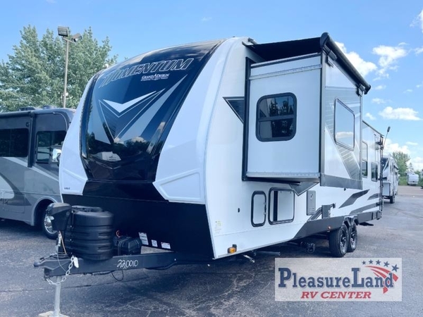 Are you looking for adventure and fun? The Momentum G-Class toy hauler by Grand Design will help you find it! You can explore during any season you choose with the Insulation Package that includes a heated and enclosed underbelly with suspended tanks, a high-capacity furnace, a moisture barrier floor enclosure, and cabinet-mounted heat ducts. Each model includes a fuel station with an interior and exterior gauge, a dovetail rear rend, and 2,500-LB tie-downs anchored into the chassis. Throughout the Momentum G-Class interior, you'll enjoy many comfortable features like large panoramic windows, a shower skylight, USB chargers in the bedroom, and residential cabinetry.