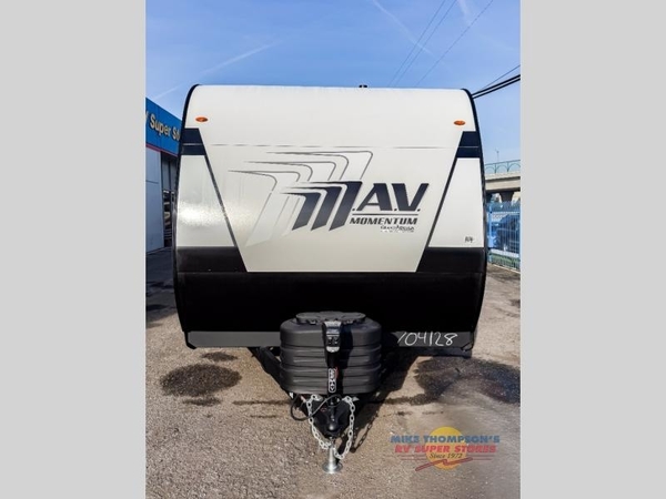 The Momentum MAV toy hauler travel trailers by Grand Design are designed to provide exactly what you need. The spacious garage provides tons of cargo space, with no wheel wells to get in the way. Additional storage includes magnetic storage door catches, and overhead consoles throughout. Conveniences like motion sensor lights and USB outlets will make your life easier, and you will be comfortable in all seasons with the 30K BTU furnace plus 15K BTU ducted air conditioning. The standard Solar Package comes with a 180W solar panel, a 40 Amp charge controller with Bluetooth, and a 12V refrigerator so you can go off-grid when the adventure calls for it.