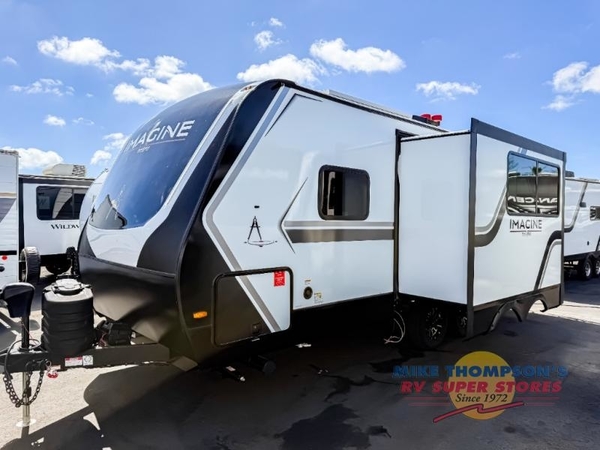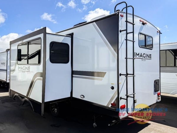 Just imagine leaving the world behind and secluding yourself away with your favorite people in your Grand Design Imagine travel trailer! The Imagine has been designed to enjoy extended season camping and includes a high-capacity furnace, a heated and enclosed underbelly with suspended tanks, a designated heat duct to the subfloor, and a high-density roof insulation with attic vent. You'll have maximum head room on the interior with 81" radius ceilings, and large panoramic windows to let in natural lighting. The exclusive drop-frame pass-through storage compartment is going to allow you to bring along lots of equipment, and the universal docking station is an all-in-one location for utilities and hook-ups. You'll also have oversized tank capacities so that you can fill and empty your tanks less often.