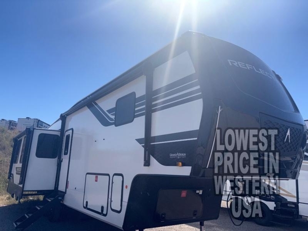 With any Reflection fifth wheel by Grand Design, you will have a solar panel for off-grid camping and a 60-amp charge controller and inverter prep, a Universal All-In-One docking station, unobstructed pass-through storage, and Goodyear Endurance tires. Each is constructed of gel coat exterior sidewalls, residential 5" truss rafters, walk-on roof decking, a fiberglass and radiant foil roof and front cap insulation plus laminated aluminum framed side walls, roof and end walls in slide rooms. Head inside to enjoy residential hardwood cabinet doors, premium Congoleum flooring, a spacious shower with a glass door, and many more comforts!