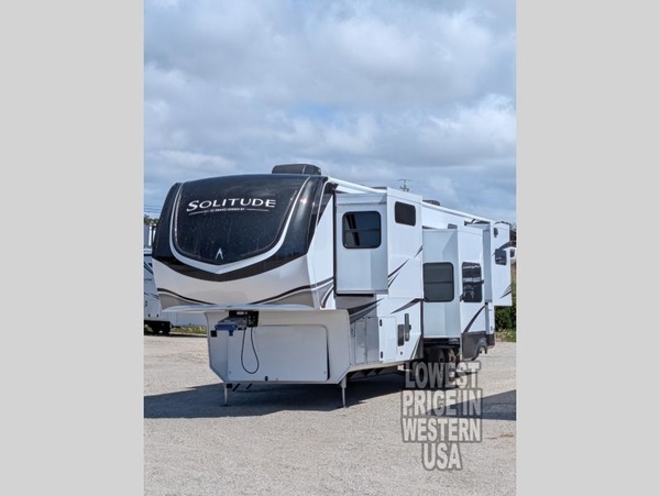 Each Solitude fifth wheel by Grand Design features a 101" wide-body construction, heavy duty 8,000 lb. axles, frameless tinted windows, and high-gloss gel coat sidewalls. You can camp during harsh weather thanks to the Weather-Tek Package that includes a 35K BTU high-capacity furnace, an all-in-one enclosed and heated utility center, and a fully enclosed underbelly with heated tanks and storage. Inside, you'll love the premium roller shades, hardwood cabinet doors, solid surface countertops, plus residential finishes throughout to make you truly feel at home. Each model also includes a MORryde CRE3000 suspension system, and a MORryde pin box that will provide smooth towing from home to campground. Affordable luxury is possible with the Solitude fifth wheels; choose yours today!