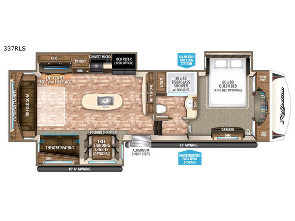 You are sure to enjoy the exterior unobstructed pass-through storage, two awnings, and all-in-one docking station.