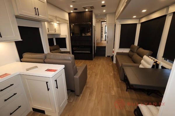 Comfort will come easy in this four slide out fifth wheel! You will feel right at home with a master bedroom that includes a queen bed slide out with a king bed option, dual dressers with a seat in between, plus a large front bath with tons of space. The convenient half bath is right as you enter the unit for convenience. Your crew can get cozy on the dual tri-fold sofas within dual opposing slides, or on the theater seating across from the LED TV and fireplace. One feature you will love about this fifth wheel is the rear kitchen with wrap-around counter space, a built-in oven, plus a 20 cu. ft. refrigerator and a large pantry to keep food fresh.