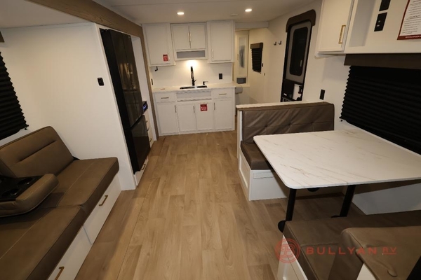 Camping with your larger family or when you want to take along a few extra friends is easy with this trailer. This unit sleeps nine with the double-size bunks in the rear corner, the 60" roll over sofa, and the queen bed in the front semi-private bedroom. The booth dinette can also be used to sleep a guest or two little ones at night once converted. Prepare your meals on the three-burner cooktop indoors, or out on the outside kitchen! You'll also find a handy exterior spray port and an outdoor refrigerator for cold drinks! It will be so easy to fill the dog's food bowl with the added pet dish under the refrigerator, and the full bath in this model means you don't have to use the camp's facilities. Having a 17' awning outside along with a large pass-through compartment allows you extended living outdoors and plenty of space for all of your gear!