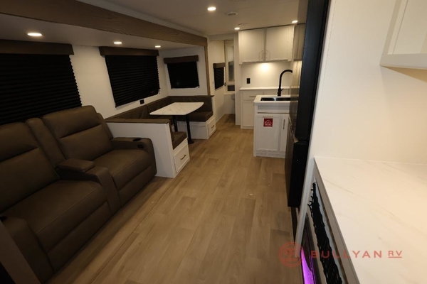 Get ready to take your travels to new heights with our incredible luxury travel trailer! The front bedroom has a queen bed, wardrobe, and overhead cabinets for all your favorite belongings, the perfect place to relax and recharge after a long day of adventure. The living room/kitchen combined area is equipped with a U-shaped dinette, three-burner cooktop, microwave, refrigerator, and pantry. The full bathroom is spacious and complete with a linen closet for added convenience. And with double-sized bunk beds featuring curtains and under-bunk storage, the kids will have their cozy retreat. But the adventure doesn't stop there! Outside, you'll find an exterior griddle with a 1.7 refrigerator, perfect for cooking up a storm in the great outdoors. And with a massive 19 awning, you'll have plenty of shade and protection from the elements, plus, with two entry/exit doors and pass-through storage, you'll have easy access to the trailer and all your gear.