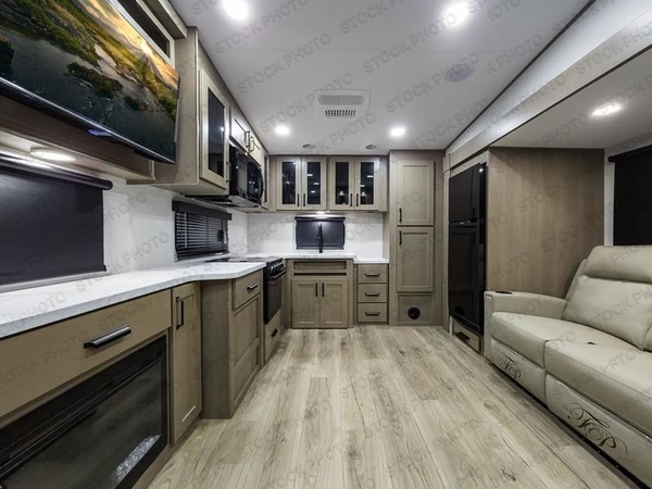 You will love this fifth wheel featuring a single slide for added interior living space and all the comforts and conveniences it provides you while you travel. The slide features a 78" theater seat plus there is a breakfast nook for more seating. Both can easily view the entertainment center with 40" TV. A rear kitchen indoors provides everything you need to create meals like home while on the road, and if you want to spend as much time outside as possible, then the outdoor griddle will certainly accommodate you for meals. Up front, a cozy private bedroom with queen bed, wardrobe, and overhead cabinets. Right next door, you will find a large walk-in shower, as well as a toilet, and a vanity with sink and linen cabinet for your towels and toiletries. You will also love the full unobstructed pass-through compartment for all of your gear, plus so much more!
