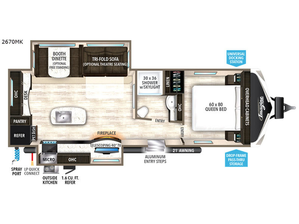It's time to imagine yourself on a week long trip with the ability to work in the morning and play in the afternoons. This 2670MK travel trailer has the perfect layout for a couple that likes to watch TV, cook, and get some work done when needed. There is a desk, kitchen island, and 40" telescoping TV with fireplace below, plus a pet dish drawer for your best friend. You can even bring the grandkids along with you thanks to the extra sleeping space provided by the furniture. The outside kitchen adds a second location to prepare and make meals while enjoying the great outdoors. Come see why this Imagine can allow you to enjoy the world all while working remotely.