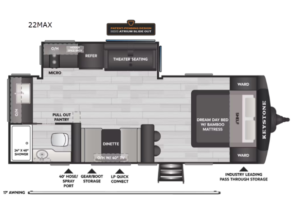You and your spouse will love this travel trailers plush dream day bed with a comfortable bamboo mattress. Ample storage is provided by the wardrobes on each side of the bed, keeping your favorite outfits within easy reach. The booth dinette and theater seating provide perfect spots to enjoy meals, play games, or relax with loved ones. Plus, the layout is designed to maximize comfort and conversation. Whip up meals and snacks with ease and enjoy the convenience of having everything you need in one place since the kitchen is equipped with essentials, including a refrigerator, microwave, and pull-out pantry. Also, the full bathroom provides a convenient private space to get ready for the day.