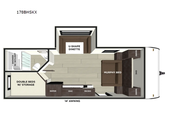 Bring your whole crew along for trips in this roomy travel trailer that can sleep eight people each night. Once you've set up the 14' power awning with LED lights, then relax in your camp chairs. Explore some trails or take your fishing poles down to the river, then head back to the trailer to clean up in the full bath. The kids may want to rest on the double-size bunks, while the adults play a game around the U-shaped dinette. This model also includes a sofa plus a Murphy bed that lowers over the sofa when you're ready for bed. Don't let this travel trailer slip away!