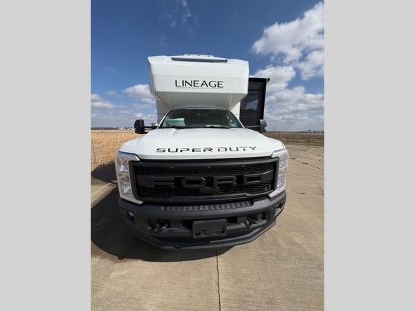The capable Lineage Series F Super C diesel motorhome by Grand Design is your ticket to adventure! There is a Fox Factory Suspension Package for optimal handling, and you can go off the beaten path with the 6.7L power stroke diesel 4x4 chassis. This coach sits on the Ford F-600 super duty platform and features a MorRyde tubular steel frame for added strength and durability. You'll find many at-home comforts inside, including Shaw commercial grade vinyl flooring, a porcelain toilet, a spacious cab over bunk and more comforts. Some of the convenient utilities include a Firefly integrations touch screen, Titan 4-point hydraulic leveling jacks, a Truma Aqua Go Comfort on-demand water heater, and a whopping 900-watts of solar power provided by the (5)180-watts solar panels!