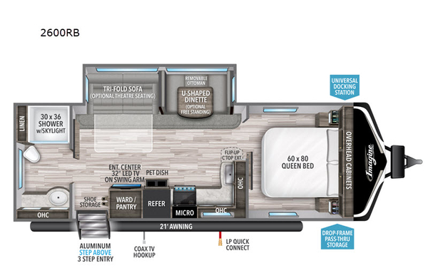 Imagine yourself placing your tennis shoes in the shoe storage before relaxing on a tri-fold sofa, or eating a snack at the U-shaped dinette. You can even fill your dog's water bowl in the pet dish drawer below the refrigerator. This travel trailer has the perfect layout for a couple or a family of five to six. The kitchen and bath amenities allow you to make meals, and skip the public facilities. When it is time to retire for the evening you can retreat to the front bedroom with a space savings sliding door. Now imagine you own this trailer and how many places you have already visited.