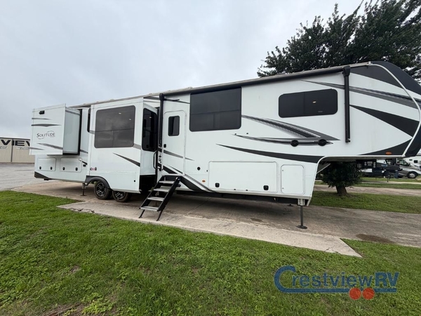 Each Solitude fifth wheel by Grand Design features a 101" wide-body construction, heavy duty 7,000 lb. axles, frameless tinted windows, and high-gloss gel coat sidewalls. You can camp year around thanks to the Weather-Tek Package that includes a 35K BTU high-capacity furnace, an all-in-one enclosed and heated utility center, and a fully enclosed underbelly with heated tanks and storage. Inside, you'll love the premium roller shades, hardwood cabinet doors, solid surface countertops and sinks, plus residential finishes throughout to make you truly feel at home. Each model also includes a MORryde CRE3000 suspension system, self adjusting brakes, and a MORryde pin box that will provide smooth towing from home to campground. Affordable luxury is possible with the Solitude fifth wheels; choose yours today!