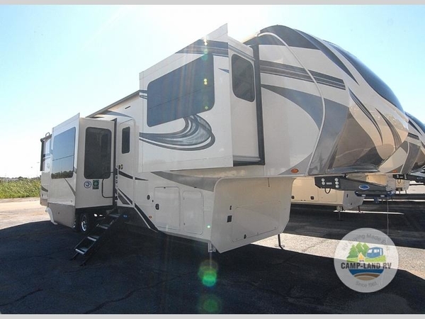 If you have been wanting to make the move to full-time RVing, then grab this Solitude fifth wheel that has plenty of interior space with five slide outs, extra sleeping accommodations for the grandkids in the front separate living area, and plenty of storage for all your things. You will find a dream kitchen for the family cook, and the free-standing dinette offers a cozy place to eat meals. The master suite features a King-bed slide across from an LED TV, and the rear master bathroom offers dual sinks, one for you and one for your spouse. You might even decide to add a few options such as a washer/dryer or king-size bed. Outside, there is a pass-through storage compartment and rear storage with a sliding tray to make getting to your gear easy.