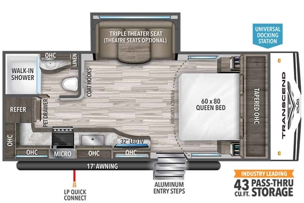 Step inside the Transcend XPLOR 200MK and you will see a roomy kitchen with plenty of counter space and storage! The kitchen counter stretches from the door all the way to the back of the trailer for lots of prep space, and there are several drawers and large overhead cabinets for storage. The bathroom offers a roomy walk-in shower, extended vanity counter, and plenty of cubby storage for all your needs. You'll love the queen bed, which is standard residential size and requires no special sheets.